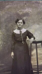 A woman stands facing the camera in an old studio portrait with a slightly faded sepia tone. She wears a long, dark, long-sleeved dress, cinched at the waist, with a wide, embroidered white collar and a light-colored cord that falls down the front, giving her a very late 19th-century look. Her hair is pulled back on either side of her head, she smiles slightly, and rests her right hand on a small wooden table in front of a textured painted backdrop typical of old photographic studios.